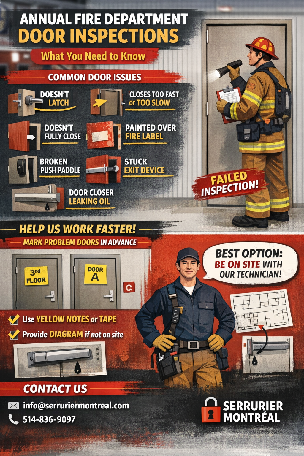 Attention building owners and managers! 🏢🔥 The fire department requires yearly door inspections to ensure safety and compliance. At Serrurier Shay Locksmith, we specialize in inspecting and fixing all types of doors so you pass your inspections without stress.